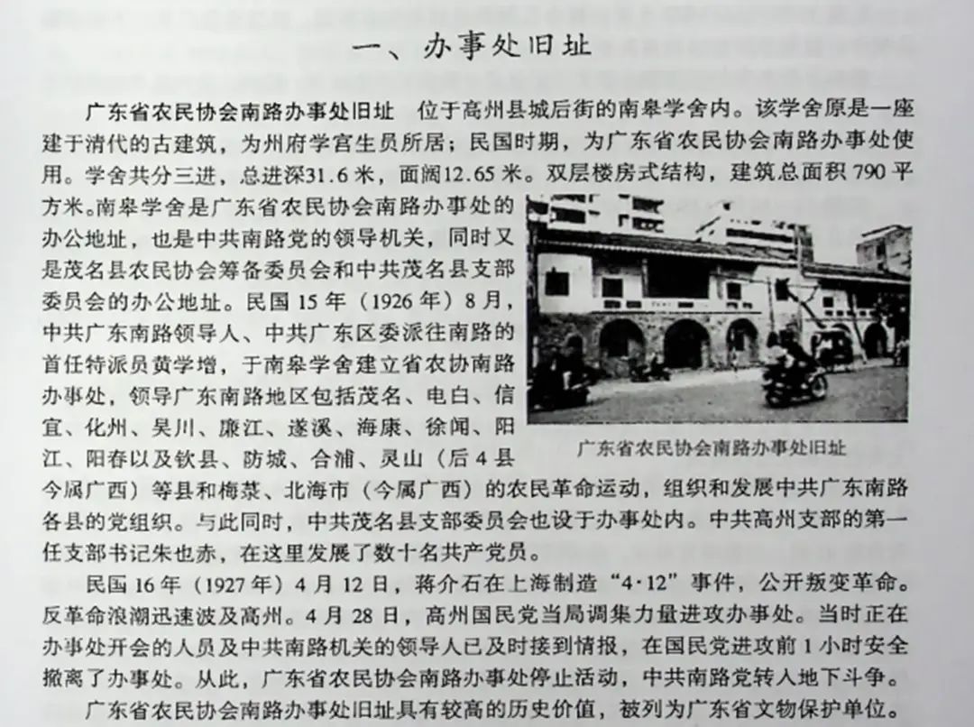 1926年5月,中共茂名县支部设在南皋学舍,朱也赤任书记,茂名县革命运动开展得如火如荼。同年7月,中共南路特派员、广东省农民协会南路办事处主任黄学增到茂名县(今高州市)组织和领导农民运动,将原设于梅菉的领导机关迁至茂名县南皋学舍。广东省农民协会南路办事处下辖阳江、阳春、茂名、电白、信宜、化县、吴川、廉江、遂溪、海康、徐闻、钦县、防城、合浦、灵山、梅菉、北海及广州湾(今湛江市区)等地的农民运动。1927年四一二反革命政变后,反革命浪潮波及茂名县,4月18日,设在南皋学舍的南路办事处停止活动。